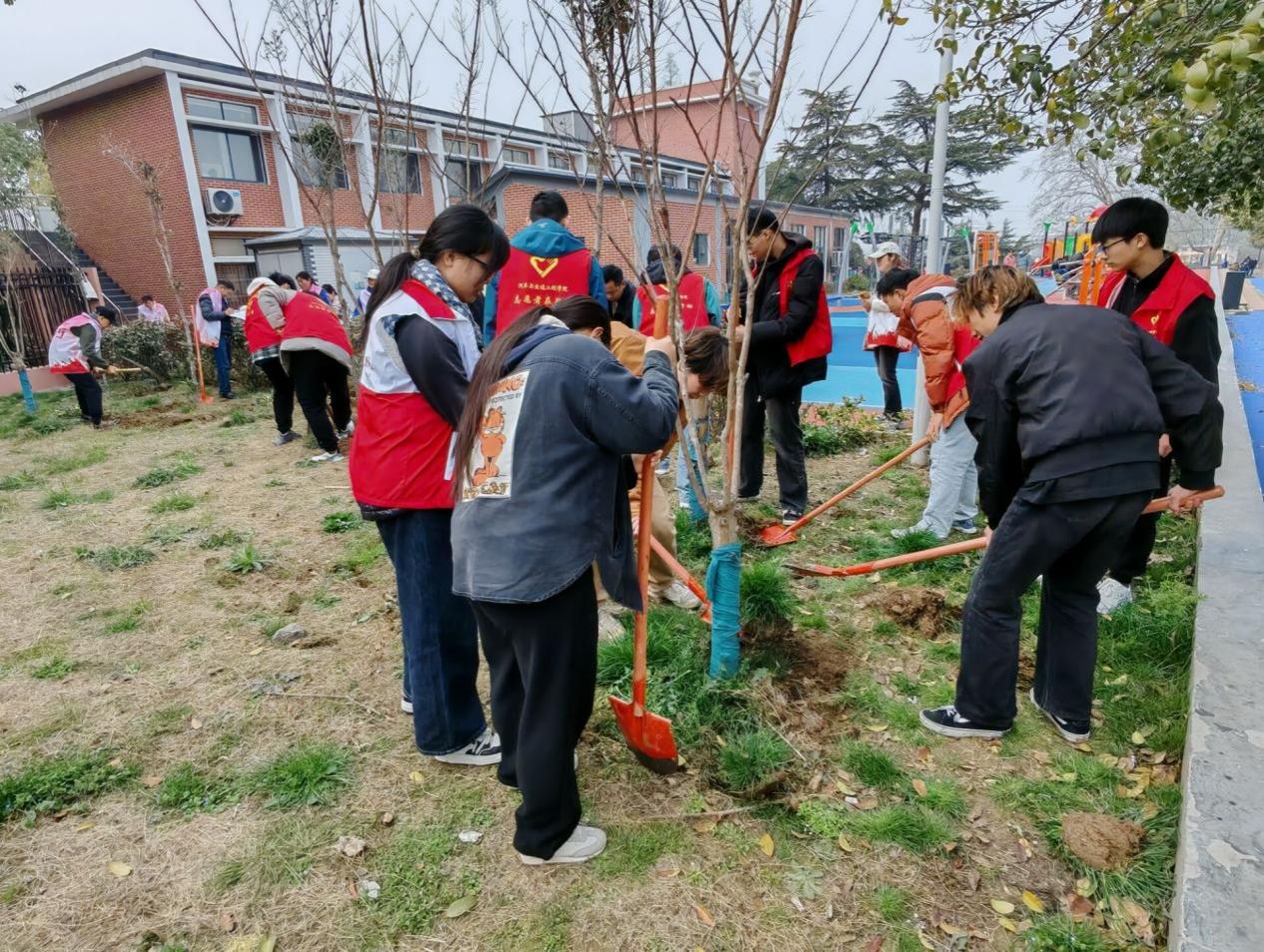 美术学院“执笔筑梦”志愿服务队与居民共同栽下月季新苗和小树