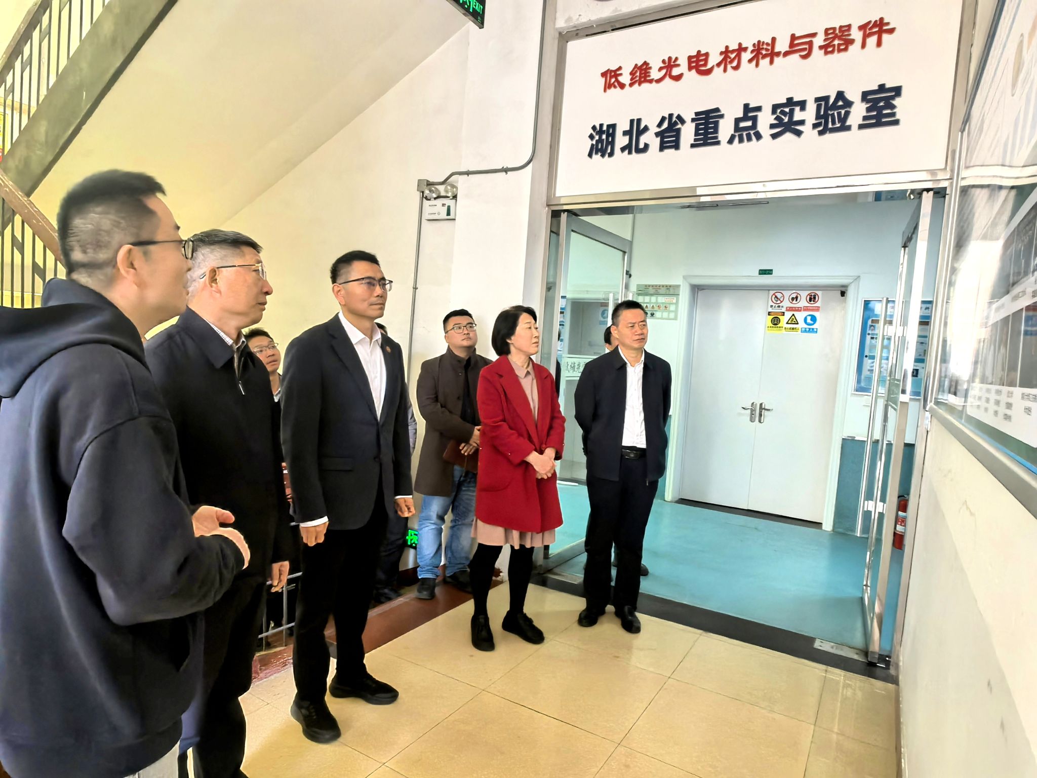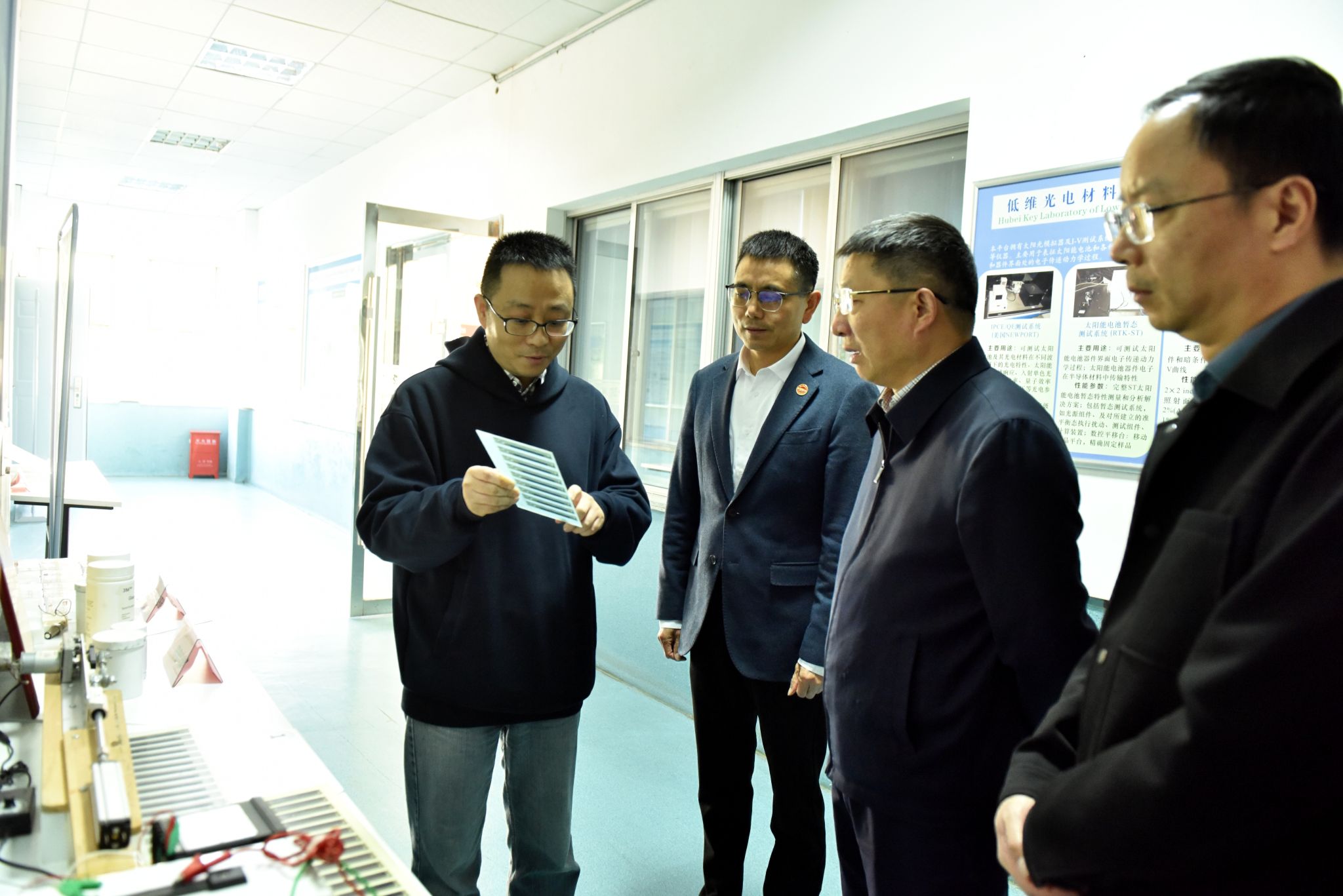 孙建刚一行实地考察了学校功能材料研究院实验室,与学校领导及科研团队进行深入交流。功能材料研究院李望南教授介绍了低维光电材料与器件湖北省重点实验室的建设历程、科研团队、研究方向、阶段性进展与成果转化情况。孙建刚对李望南潜心科研的执着精神和取得的成绩表示肯定。