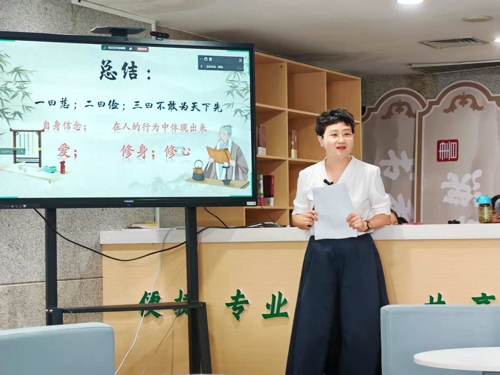 “乐之”的境界还体现在对国学文化的传承和弘扬上。王丹荣积极地向身边人传播国学知识,热情分享学习心得和体会,让更多人了解并热爱国学。当得知学校举办“践行经典·湖文读书会”活动时,王丹荣积极报名参与,在第五期活动中讲授老子《道德经》的“人生三宝”,深入浅出地阐释经典智慧。通过这种方式,她不仅为国学的传承和发展贡献了力量,也在教学相长的过程中获得了更多的快乐和满足。