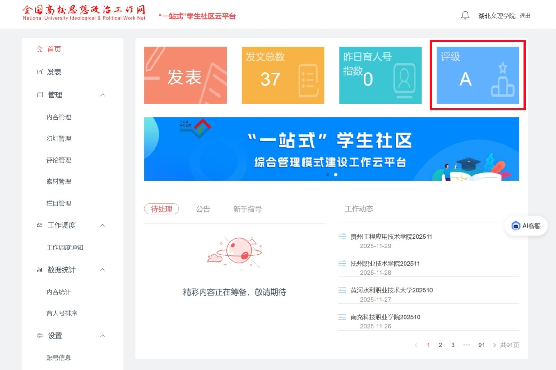 (学工处 通讯员 廖星铭)近日,全国高校思想政治工作网正式公布2024—2025学年全国高校“一站式”学生社区综合管理模式建设等级评定结果,学校“一站式”学生社区获评A级等次(最高等次)。