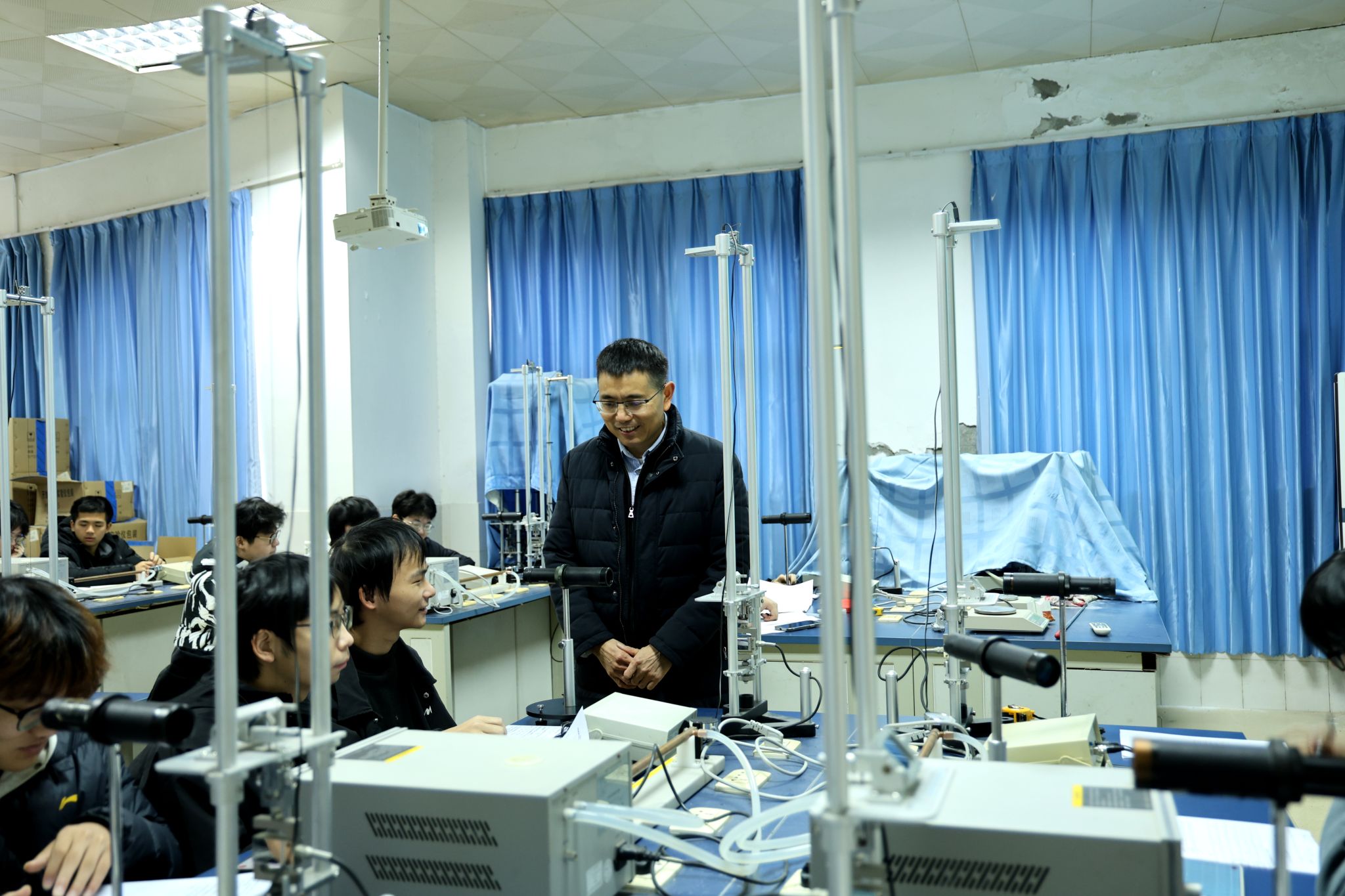 宣讲前,吴超仲走访了生活中的物理科普协会,观看师生自主设计的趣味实验装置,对协会结合生活开展科普的创新做法表示赞许。在物理光电2411班《大学物理实验》课间,他与同学们亲切交谈,关心询问学习、生活与未来规划,勉励大家珍惜时光、全面发展,将个人成长融入国家发展需要。