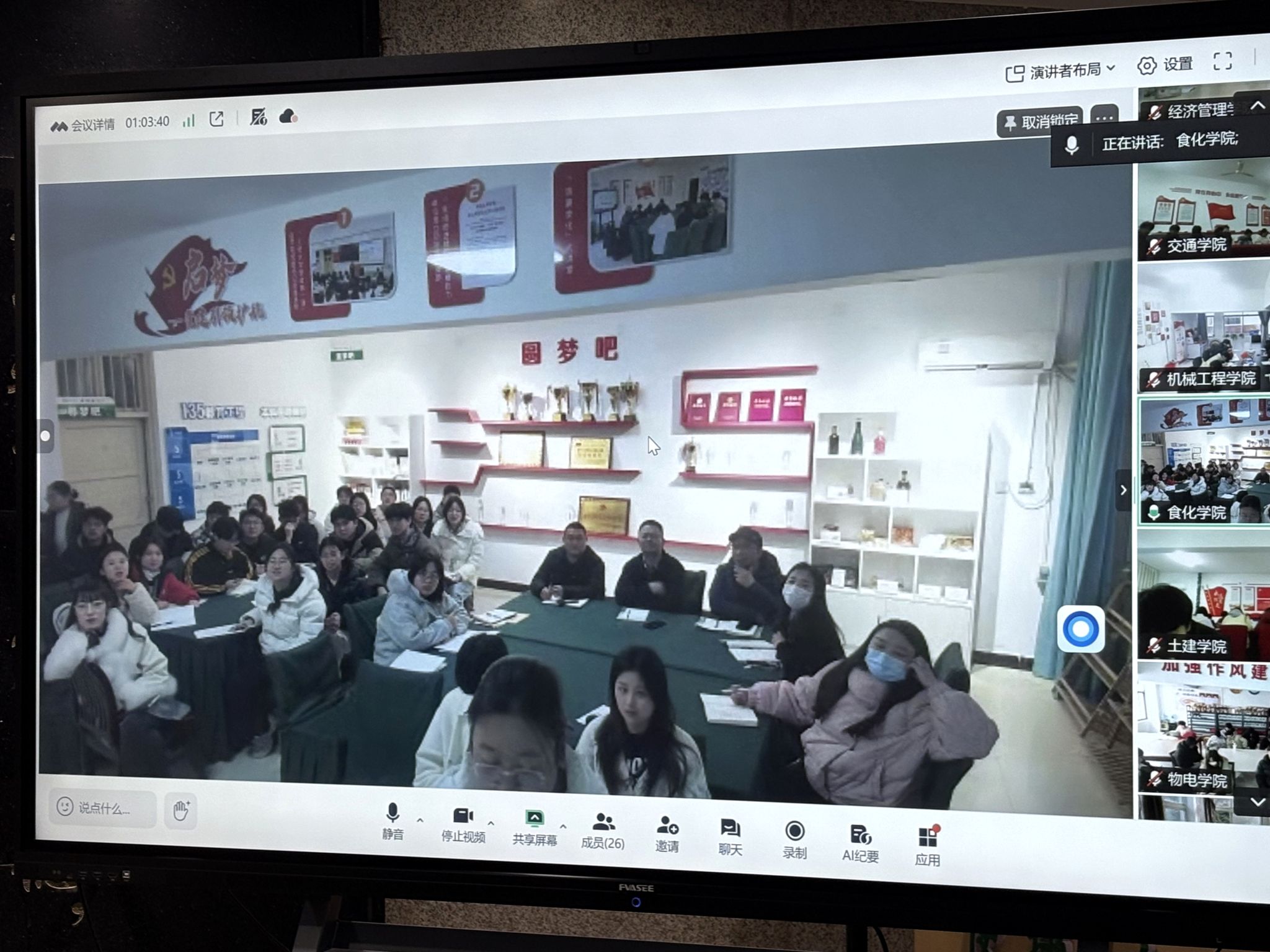 本次读书会由襄阳历史文化研究院·汉江研究院(孔明书院)、学生工作部·学工处和团委联合举办。选修《中华经典导读与践行》课程的学生、学生党员、学生干部及其他师生代表现场参加活动,各学院学生代表通过“一站式”学生社区视频连线同步参与。