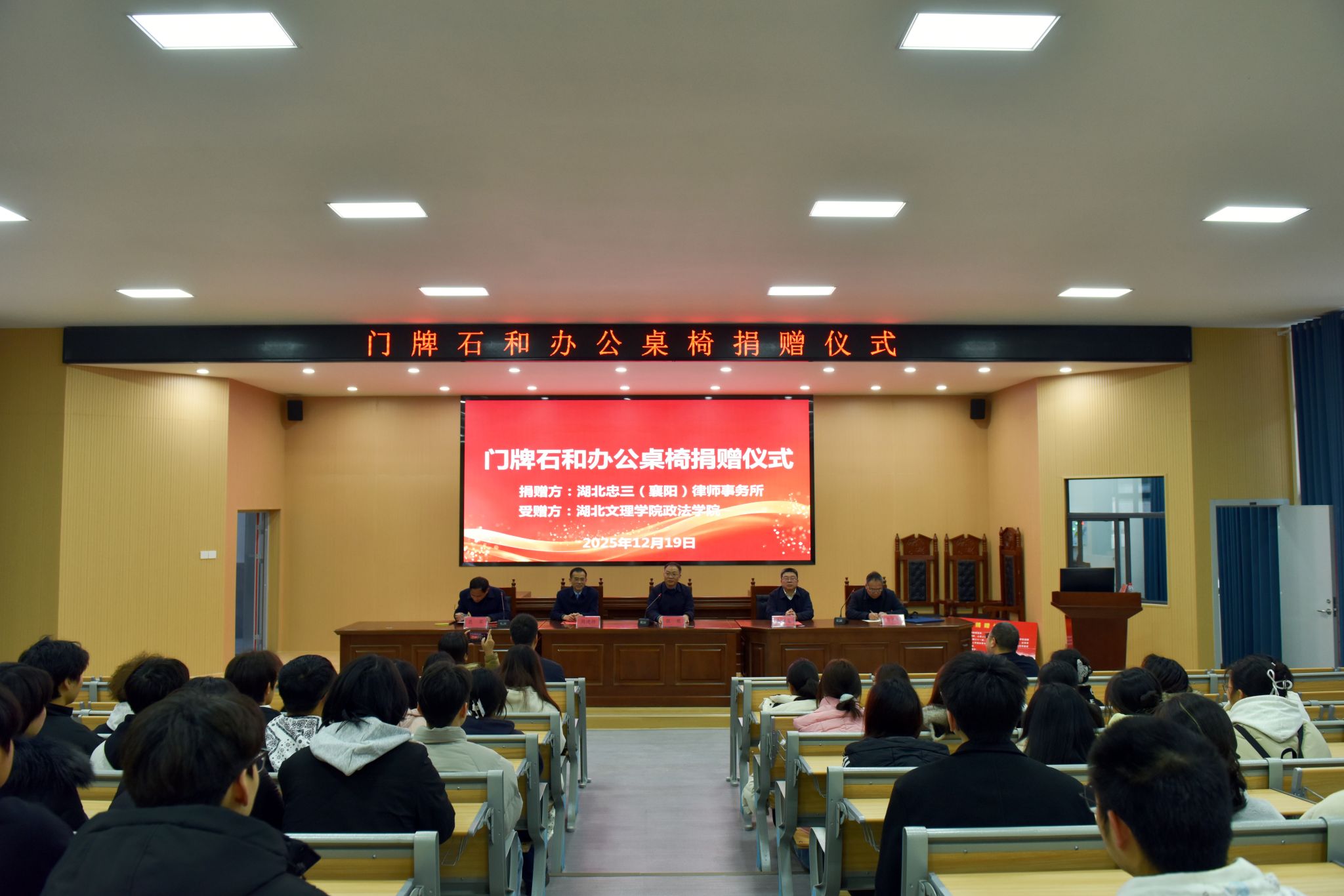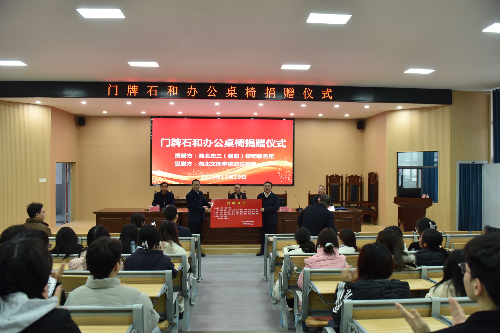 (政法学院 通讯员 何子涵)12月19日,湖北忠三(襄阳)律师事务所向学校政法学院捐赠31套办公桌椅及1块门牌石,助力学院改善办学条件。捐赠仪式在卧龙校区举行,学校党委副书记、副校长张樊出席捐赠仪式。