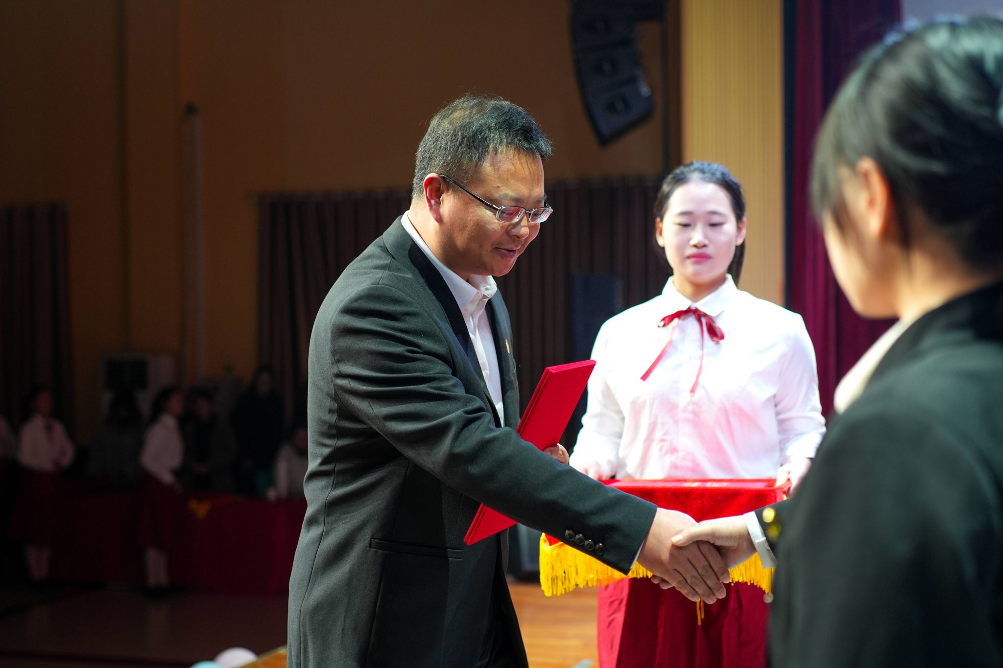 曹健为优秀班集体代表颁发荣誉证书