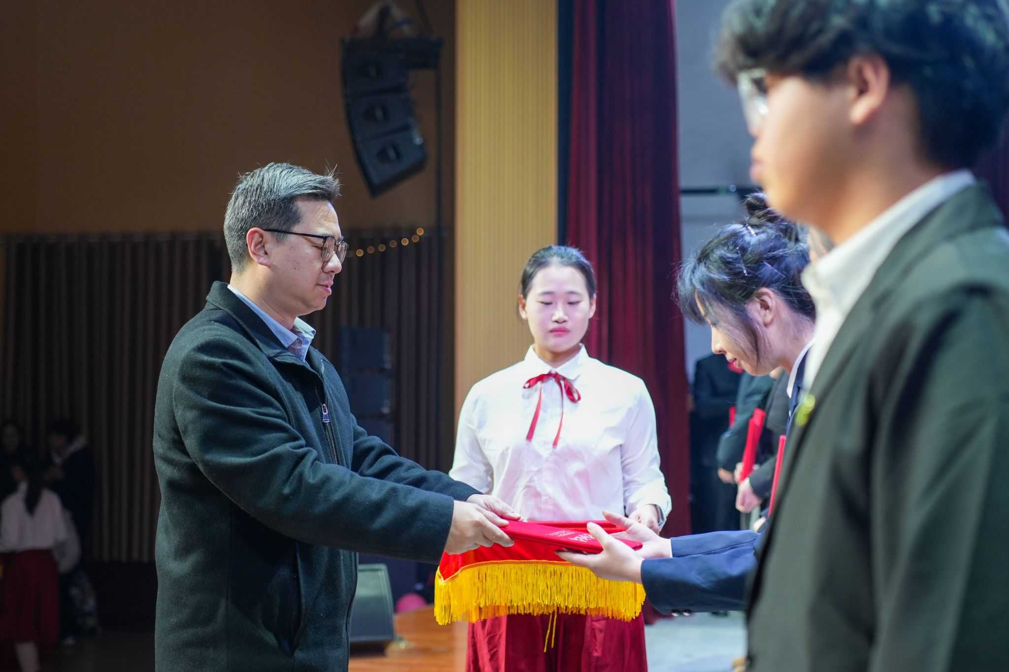 (校团委通讯员 唐棻 张尹琪)12月29日晚,学校举办“在隆中·谋天下——隆中追梦”2026年新年晚会暨学生荣誉表彰会。学校党委书记吴超仲致新年贺辞,校长杜国锋、副校长曹健、副校长杭波、党委副书记王瑶珺分别为获奖集体和个人颁发荣誉证书。