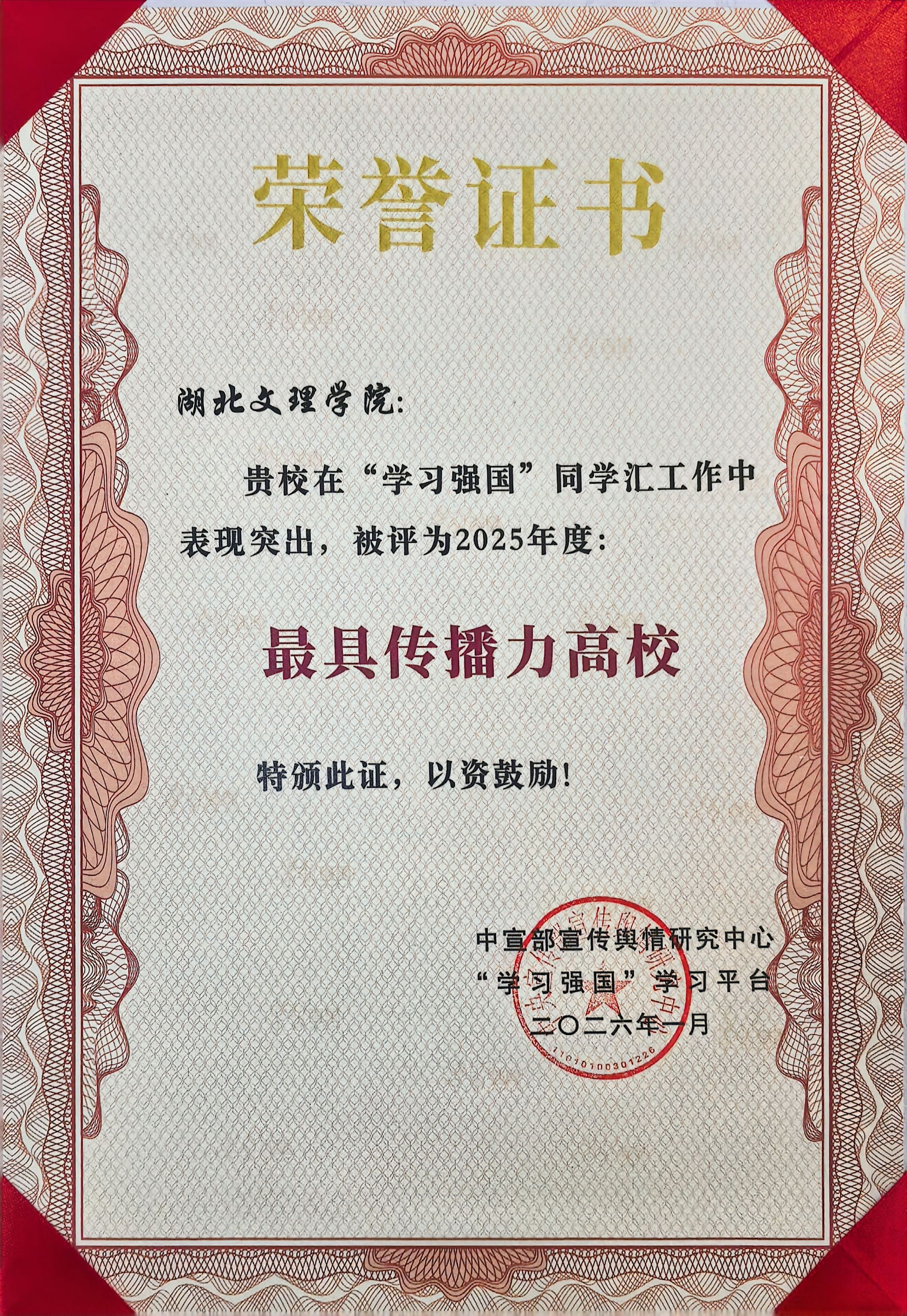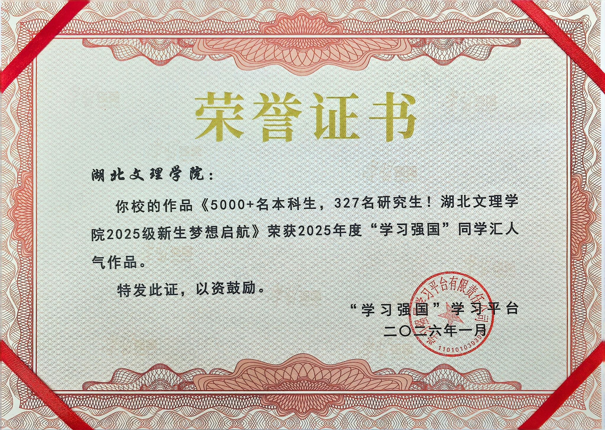 (新闻网记者 卜润慧)近日,“学习强国”学习平台公布了“学习强国”同学汇2025年度评选结果,学校被中宣部宣传舆情研究中心和“学习强国”学习平台授予“最具传播力高校”荣誉称号,作品《5000+名本科生,327名研究生!湖北文理学院2025级新生梦想启航》获2025年度“学习强国”同学汇人气作品。