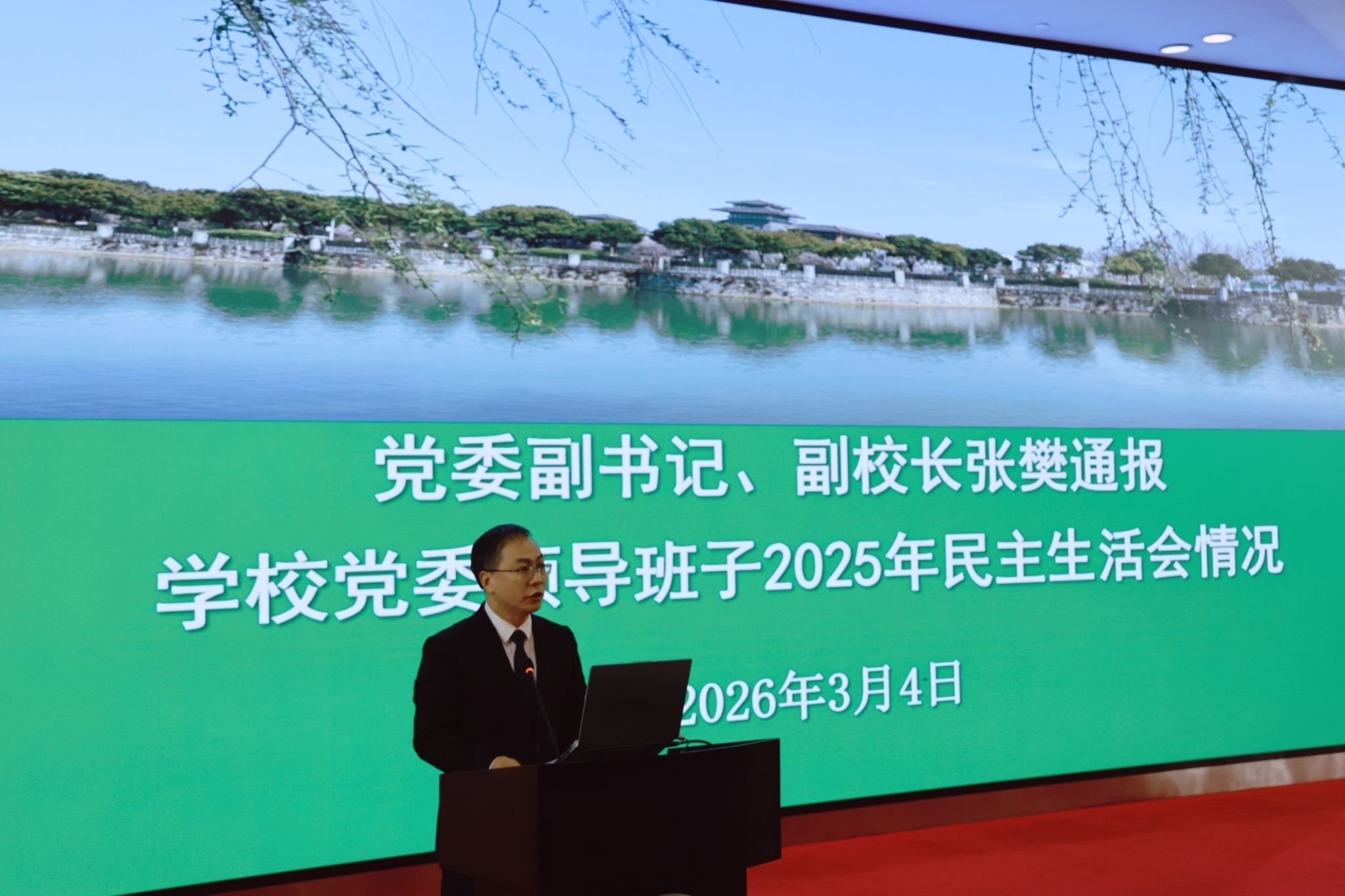 会上,张樊从会前准备、会议基本情况、下一步工作计划三个方面通报了学校党委领导班子2025年民主生活会情况。张樊强调,学校党委将以这次民主生活会为契机,坚持以习近平新时代中国特色社会主义思想为指导,深入学习贯彻党的二十大和二十届历次全会精神,全面落实习近平总书记关于党的建设的重要思想,坚守为党育人、为国育才初心使命,落实立德树人根本任务,持续深化内涵建设,奋力谱写学校“十五五”高质量发展新篇章。