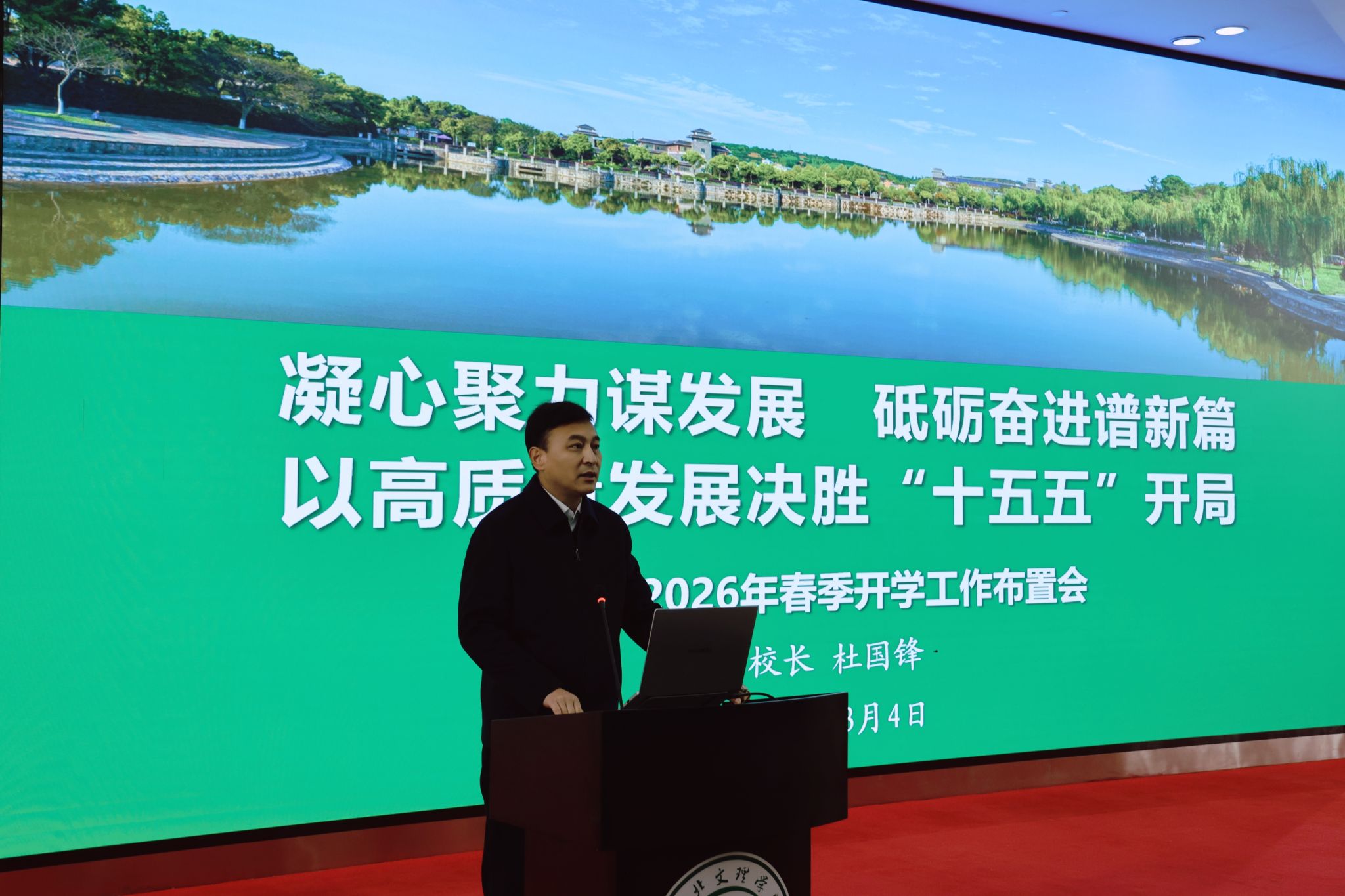 杜国锋要求,要高质量开展春季学期工作。他对开学前各项准备工作予以肯定,并对春季学期重点工作做出具体安排。各单位要紧紧围绕学校年度工作要点和春季学期重点工作任务,结合实际制定详细工作计划和落实方案;要加强统筹协调,合理配置资源,确保重点工作强力推进,常规工作有序开展,做到开局即决战、起步就冲刺;要坚持求真务实,追求实绩实效,守住安全稳定底线,以创新思维和过硬作风夯实工作根基。全校上下要团结一心、骐骥驰骋,以高质量发展决胜“十五五”开局。