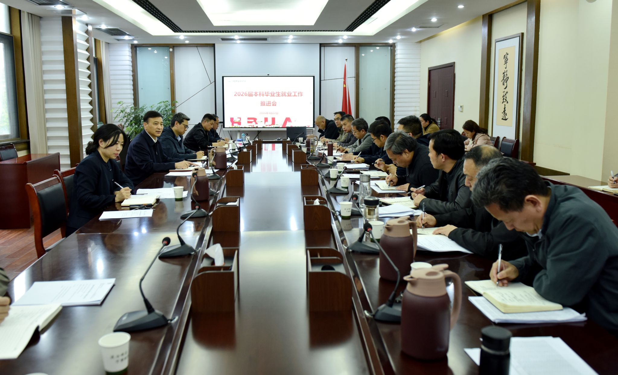 (招就处 通讯员 亢雪山)4月22日,学校召开2026届本科毕业生就业工作推进会。校长杜国锋出席会议并讲话,党委常委、副校长杭波主持会议。