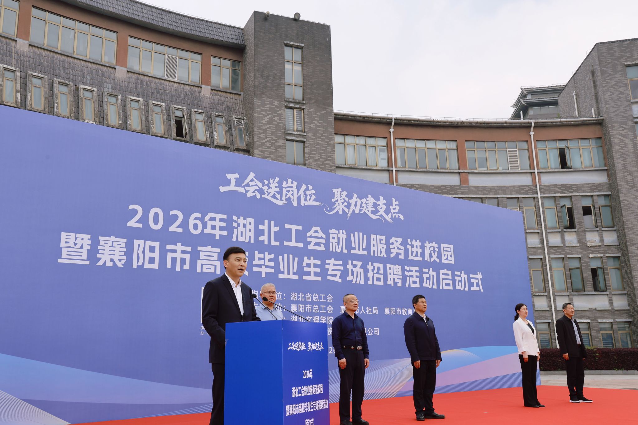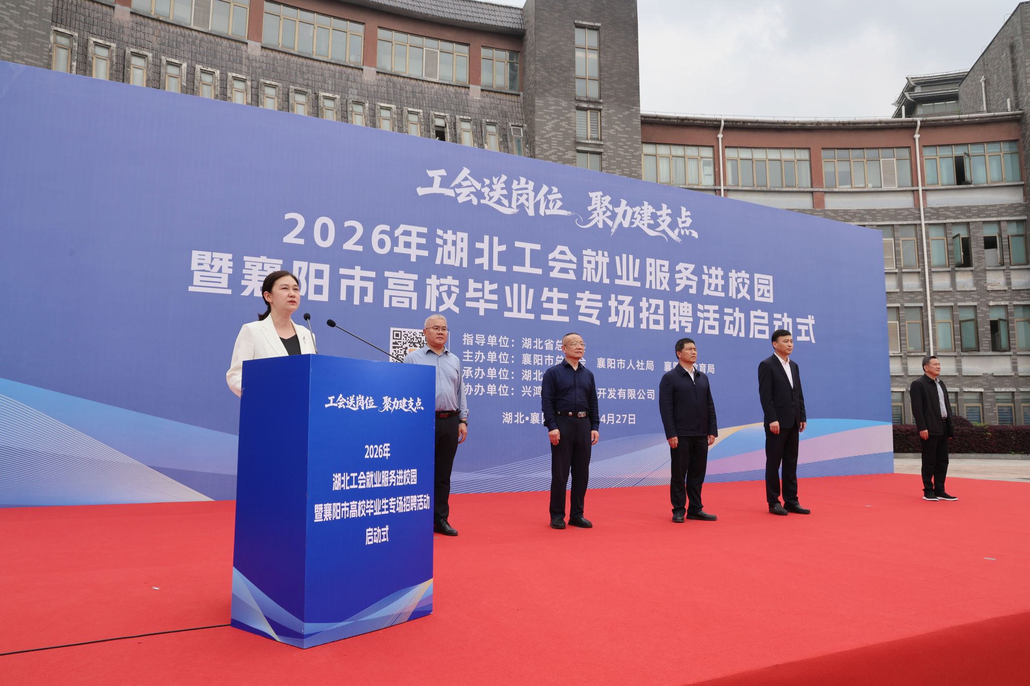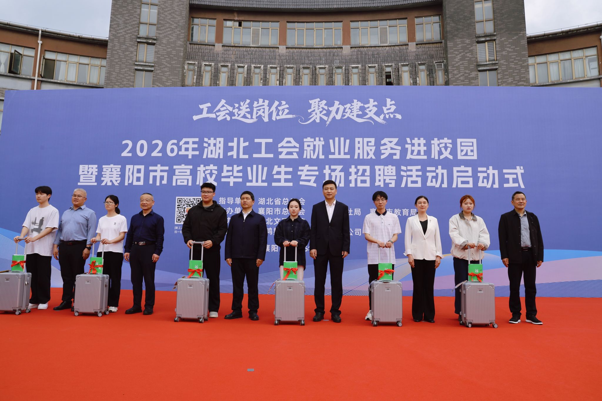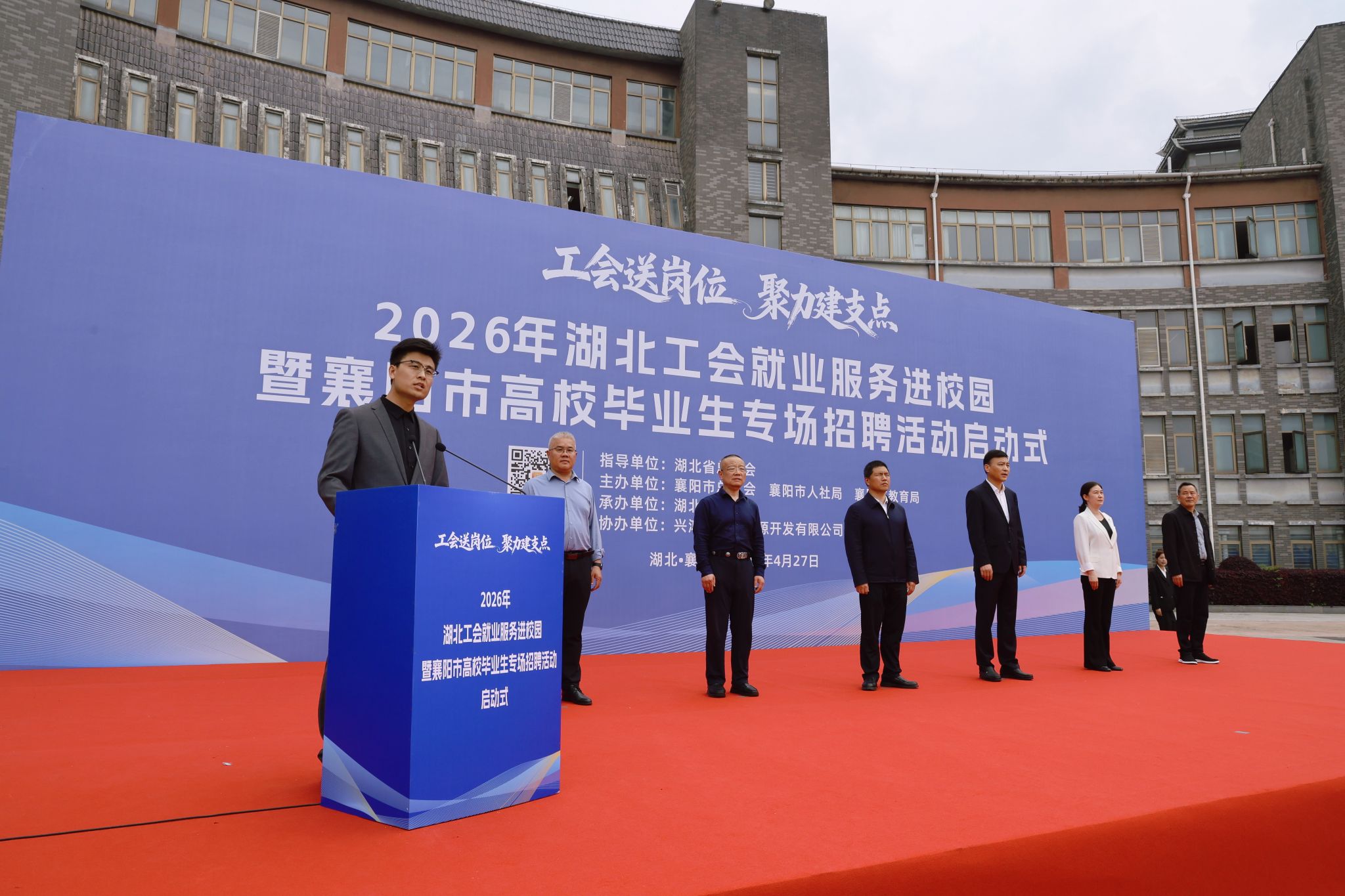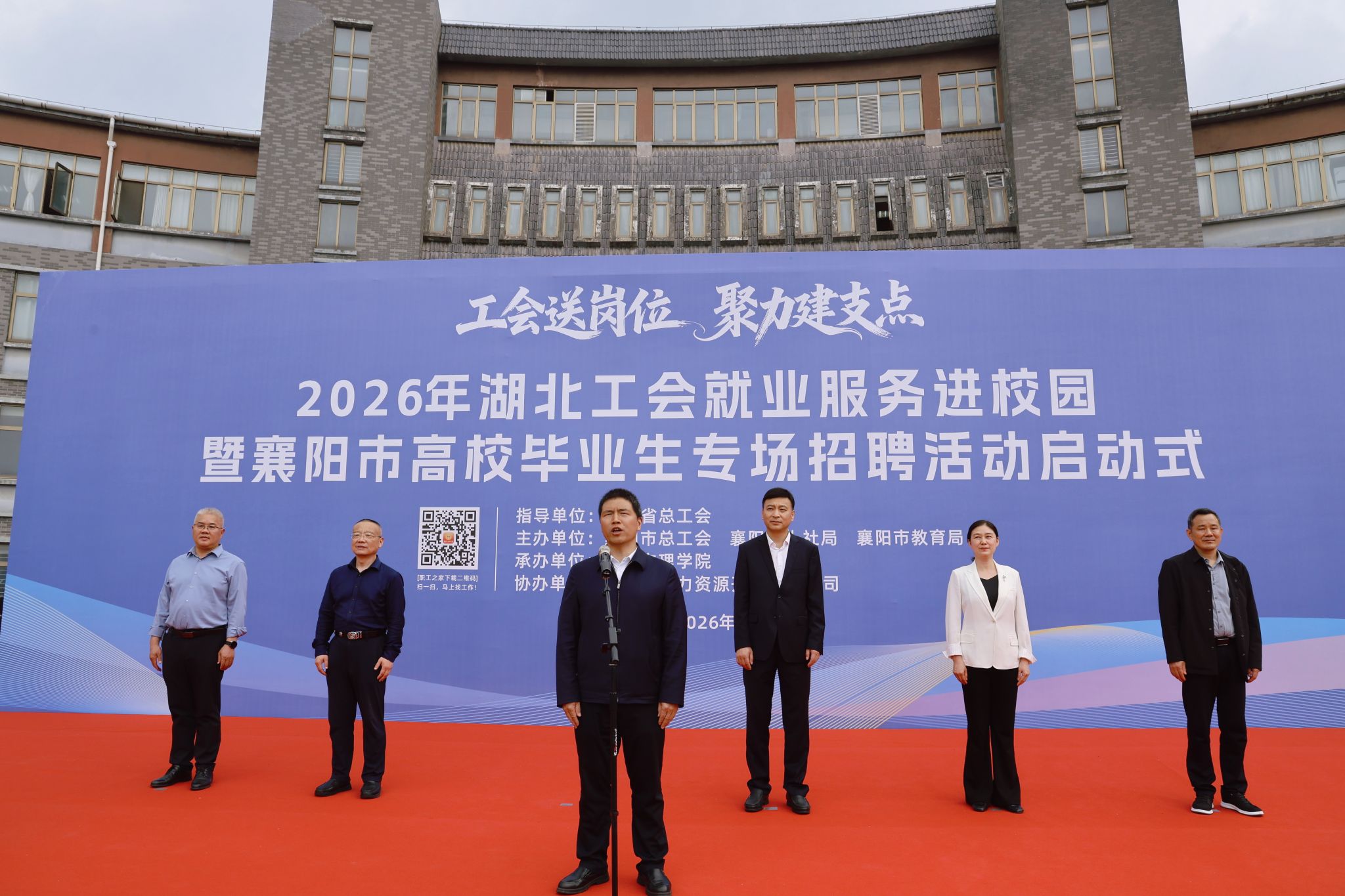 (招就处 通讯员 刘滢)4月27日,由湖北省总工会指导,襄阳市总工会、市人社局、市教育局主办,学校承办的“工会送岗位 聚力建支点——2026年湖北工会就业服务进校园暨襄阳市高校毕业生专场招聘活动启动式”在卧龙广场举行。省总工会党组成员、副主席胡甲文,学校党委副书记、校长杜国锋,省总工会权益保障部(法律工作部)二级调研员吴海飚,襄阳市总工会党组书记、常务副主席李华,襄阳市教育局副局长李茂炽,襄阳市人才中心党委委员、副主任李选超等出席启动仪式,并现场指导活动开展。活动由襄阳市总工会副主席李宏音主持。
