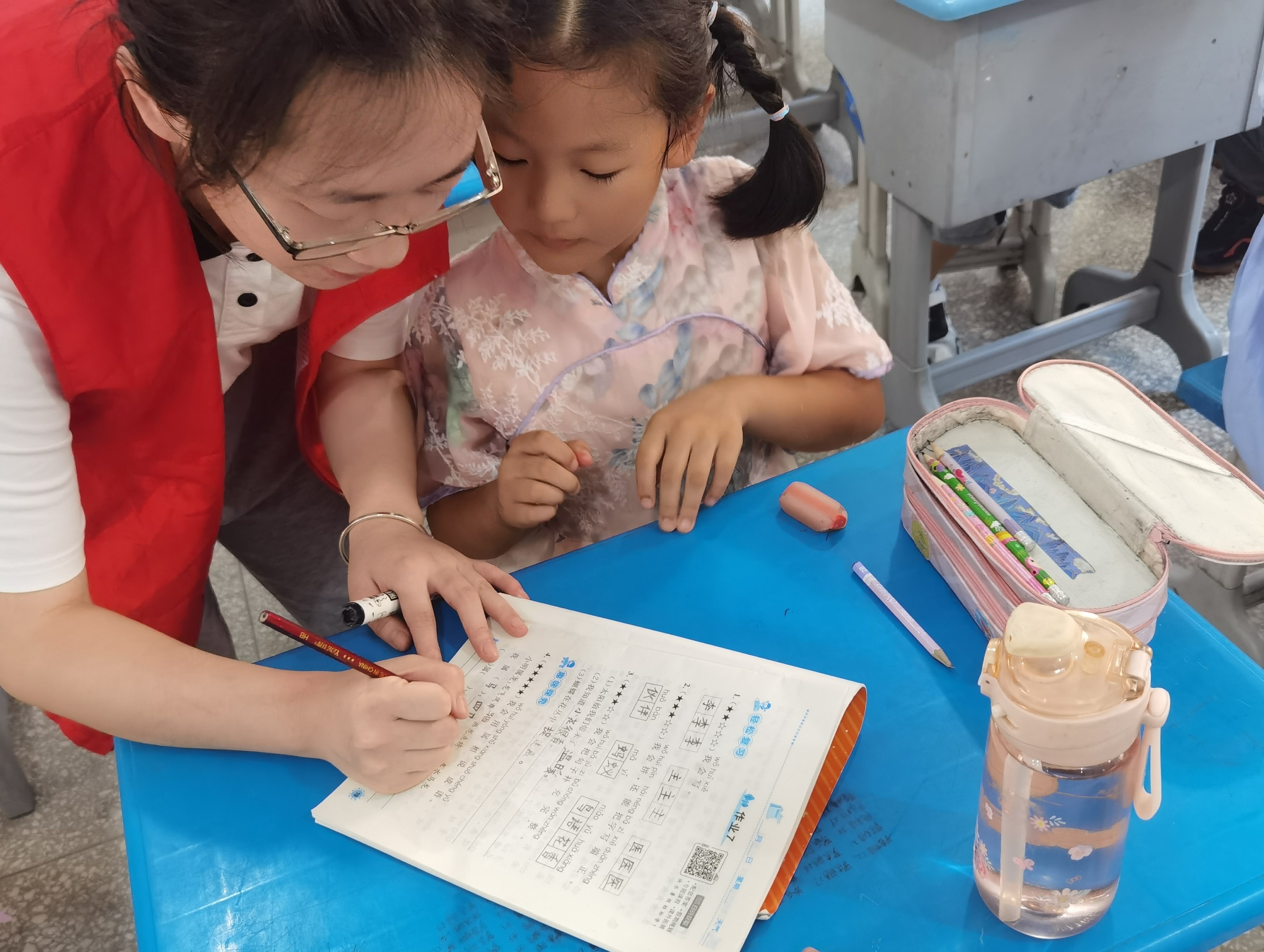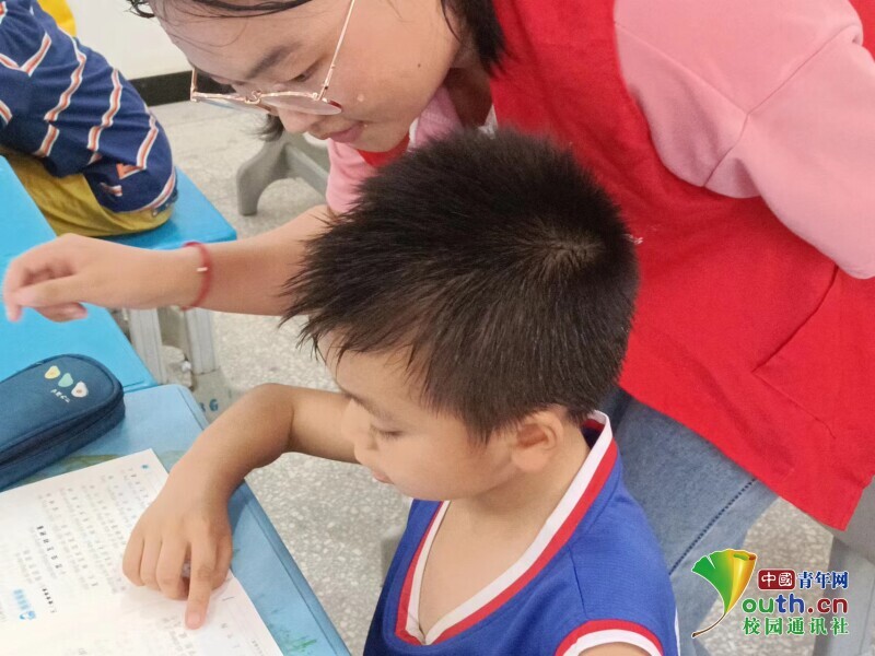 图为志愿者辅导小朋友作业。中国青年网通讯员 章彩彧 摄
