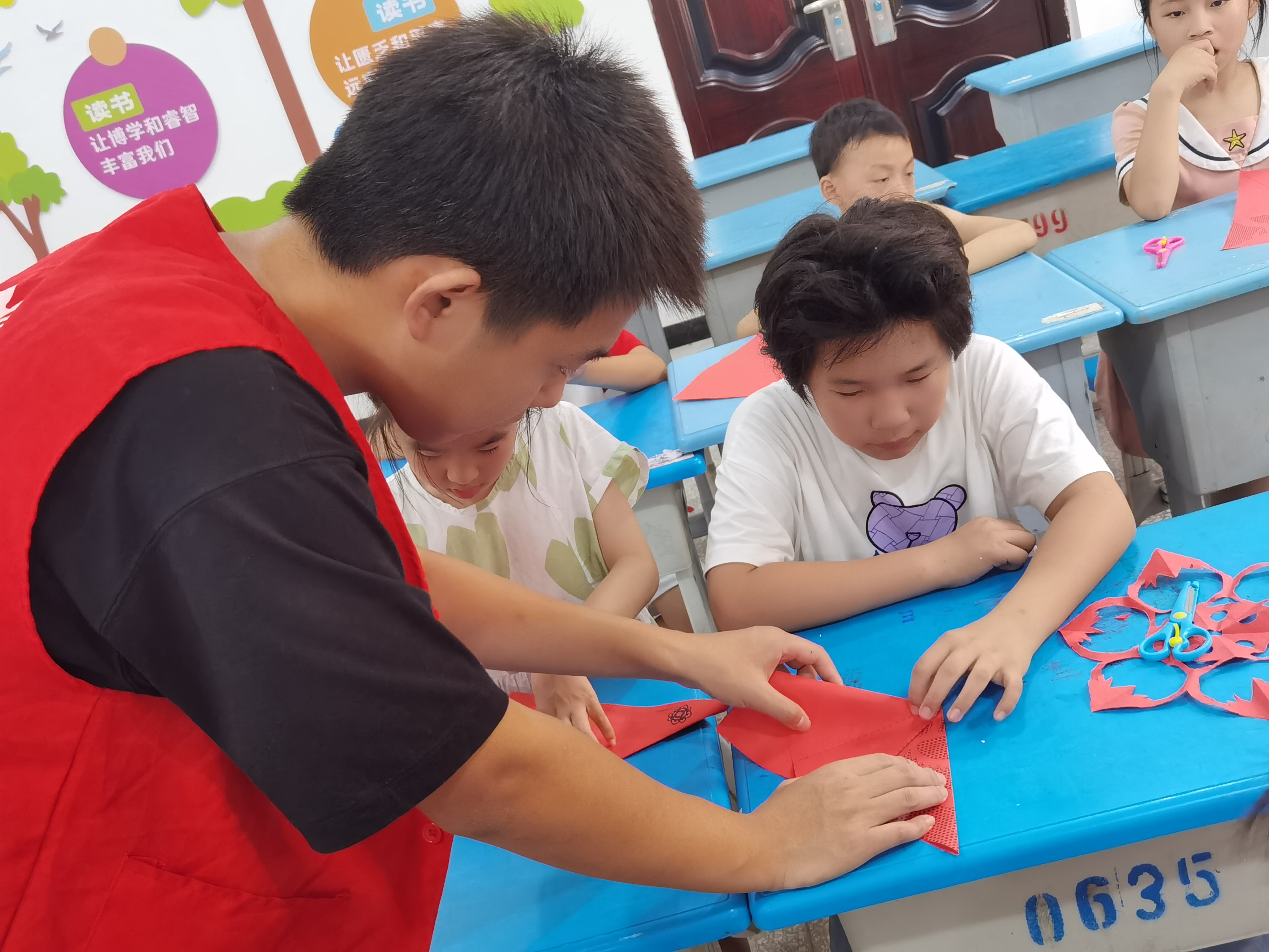 图为志愿者教小朋友剪纸。中国青年网通讯员 章彩彧 摄