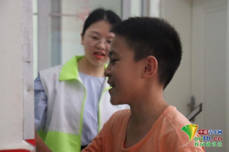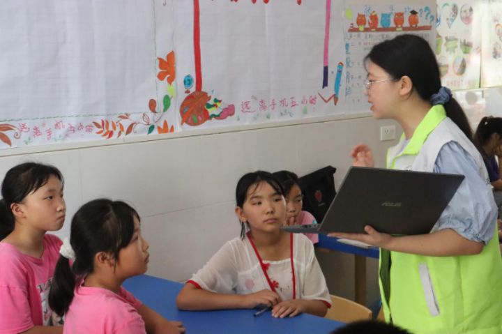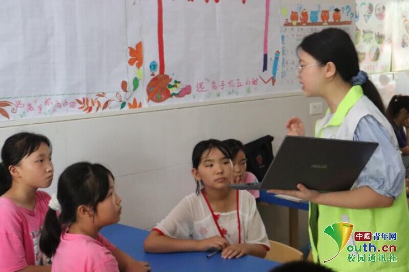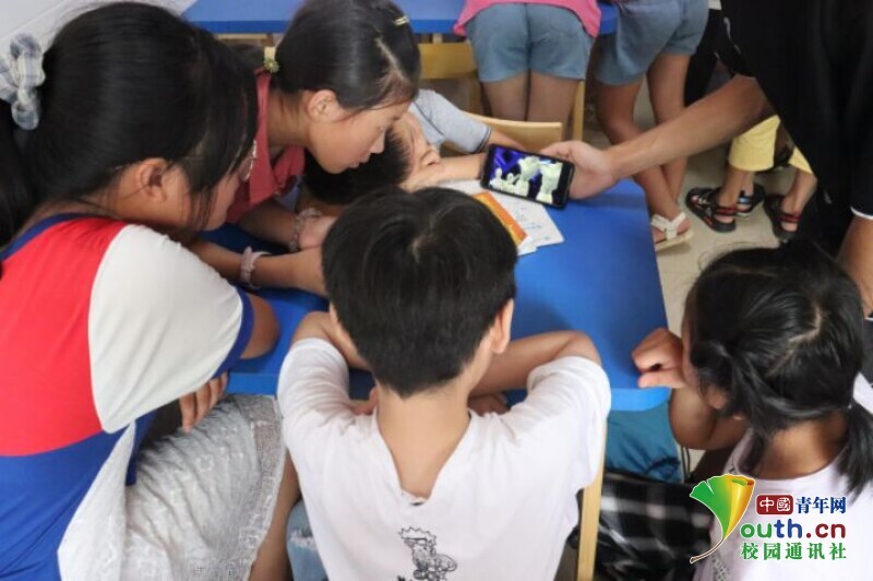 图中志愿者向学生们解释抗洪知识,解答疑惑 中国青年网通讯员 曾华宇 摄