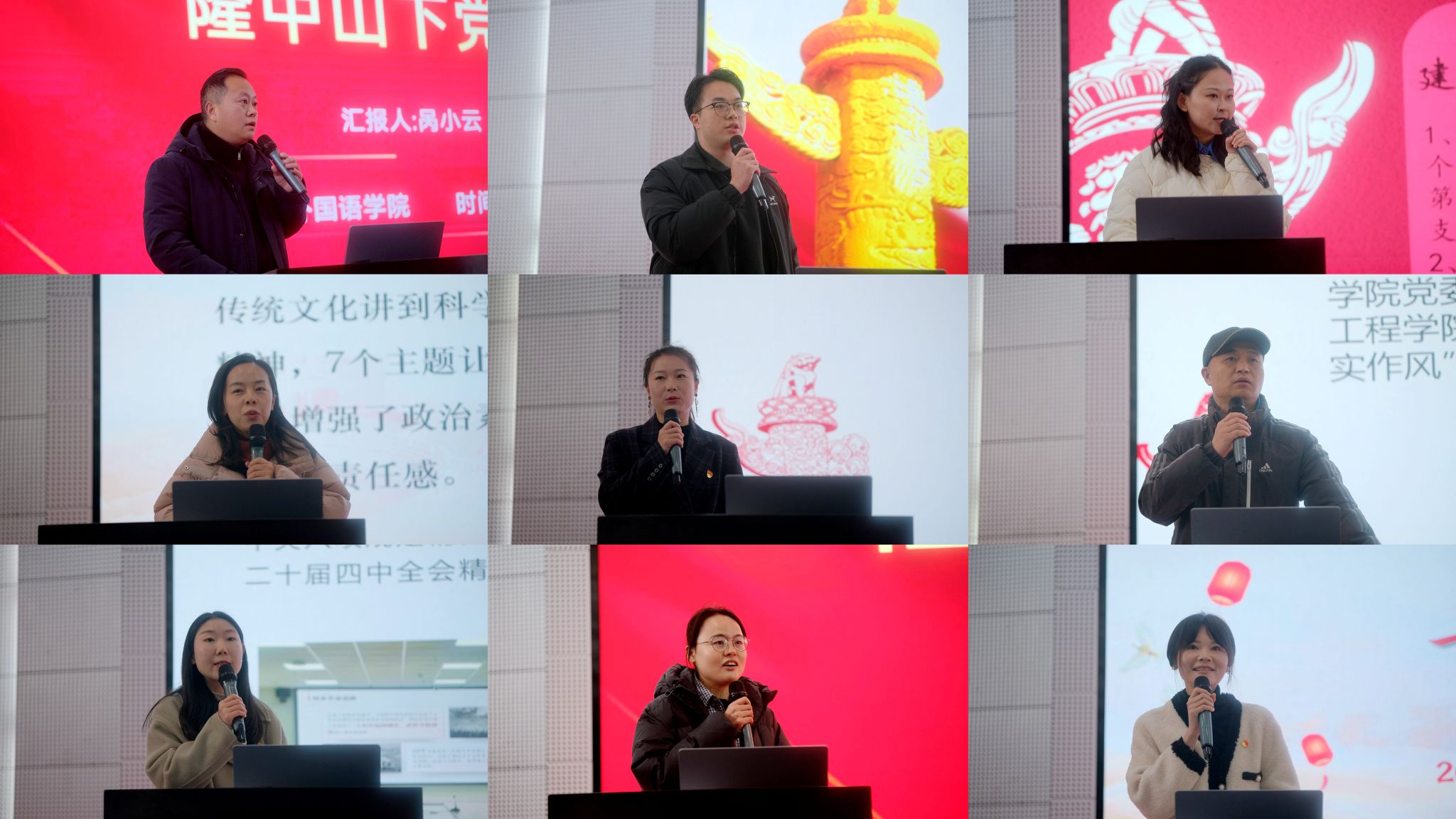各学院聚焦“隆中山下党旗飘”主题,重点展示了在强化基层党建、发挥党员先锋模范作用、深化思想政治育人等方面的特色举措;围绕“文明、书香、科技、艺术、运动”的“五个校园”建设要求,全面汇报了在相关领域的实施举措与阶段成效。