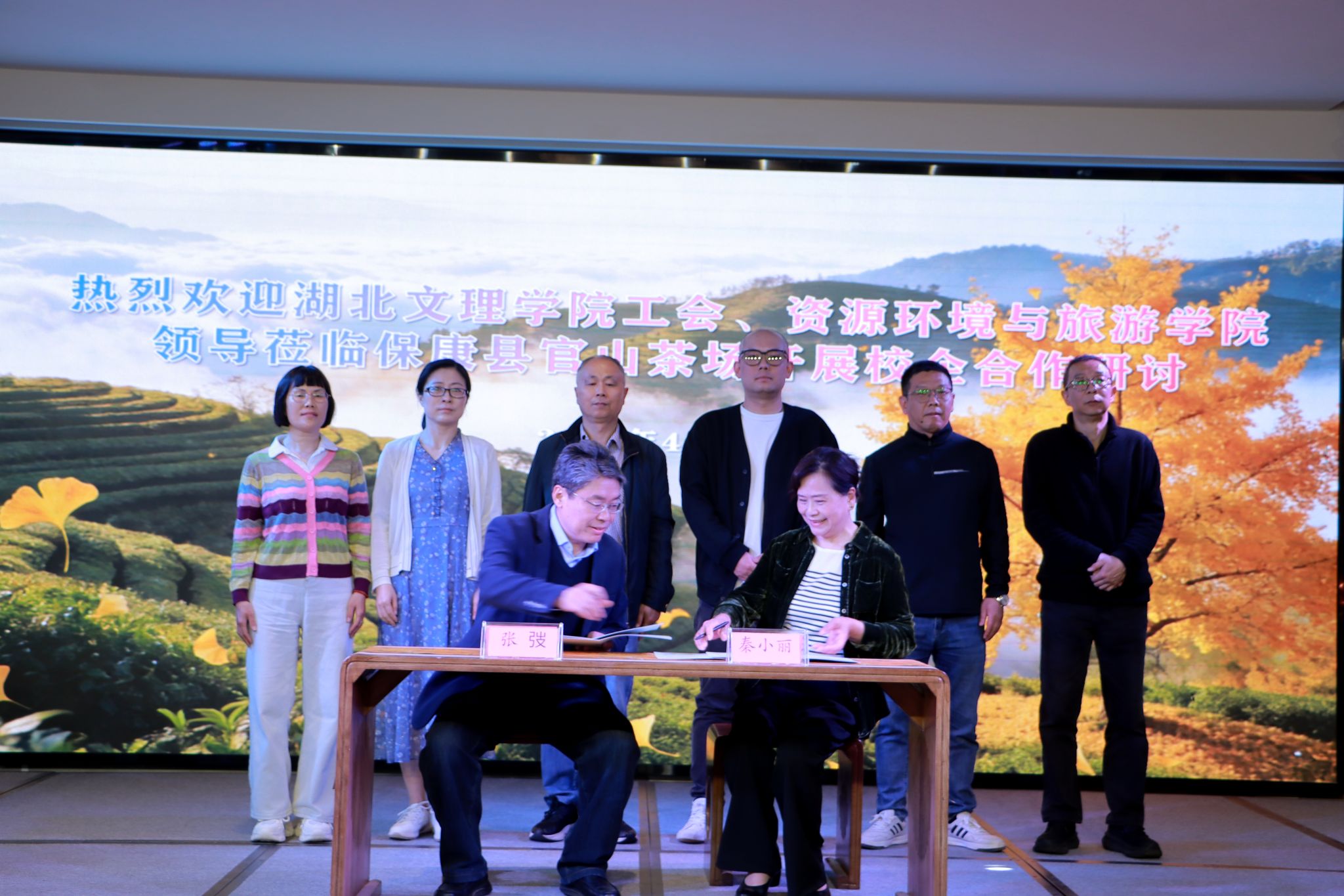 刘浩、张弢一行,在湖北官山旅游度假区开发有限公司负责人秦小丽等人陪同下,深入千亩生态茶园种植基地、农茶旅研学体验区及茶产品展销中心等运营一线进行实地调研。双方围绕官山旅游度假区开发有限公司在茶旅产品开发、运营体系搭建、品牌IP打造等方面的实际需求,结合资源环境与旅游学院在生态监测、文旅规划设计、服务运营管理等学科专业优势,就共建现代文旅产业学院、联合申报农文旅融合微专业课程体系、定向培养应用型人才、共同开展产学研项目攻关等合作达成共识,签署产教融合战略合作框架协议。