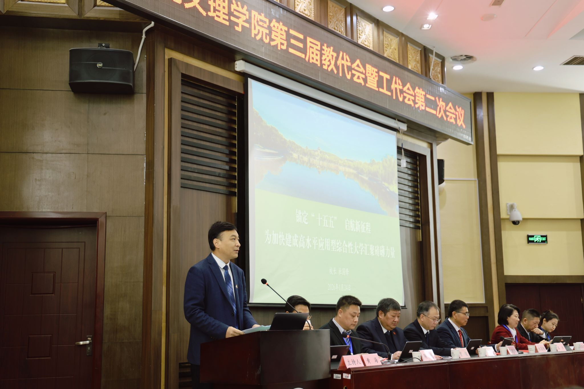 上午,大会举行第一次全体会议,学校党委副书记、校长杜国锋作学校工作报告。他指出,2025年,学校坚持以习近平新时代中国特色社会主义思想为指导,全面贯彻党的二十大和二十届历次全会精神,认真落实全国教育大会精神、省委第十二届第十一次全会精神,统筹推进教育、科技、人才体制机制一体改革,坚持立德树人根本任务,以“十大专项行动”和“四高攻坚计划”为抓手,团结带领全体师生员工攻坚克难、锐意进取,持续加强党的全面领导,推动各项事业蓬勃发展,为“十五五”高质量发展奠定了坚实基础。他强调,2026年是“十五五”规划开局之年,也是学校创建综合性大学的冲刺之年。全校上下要贯彻落实全国、全省教育工作会议精神,坚守立德树人使命,按照“党建引领、行动赋能、开放办学、服务民生”总体思路,提高政治站位,发扬攻坚精神,增强统筹能力,树牢底线思维,聚焦关键领域深化改革,继续以“十大专项行动”“四高攻坚计划”为牵引,一体化推进教育、科技、人才工作,为“十五五”发展开好局、起好步。