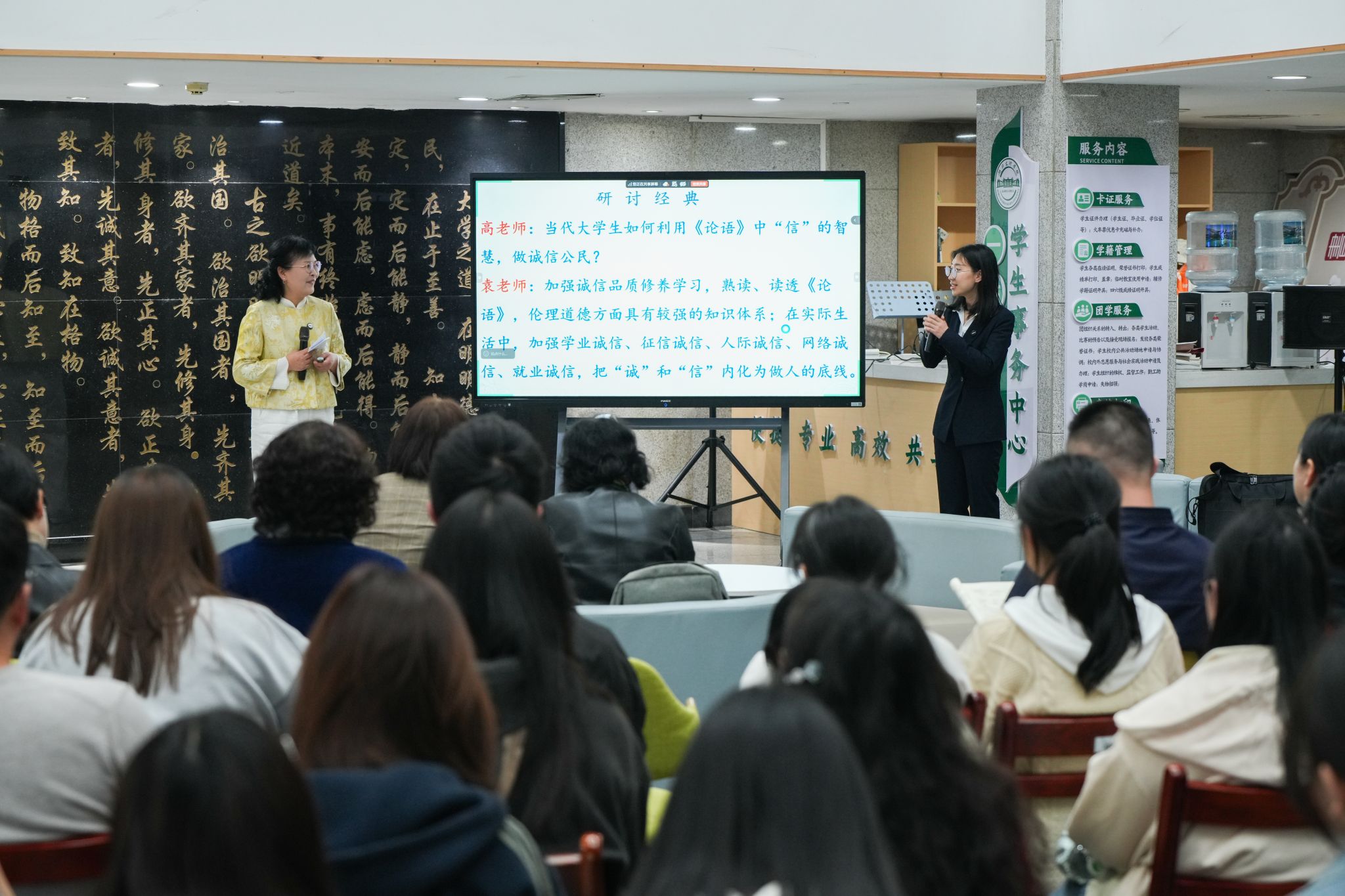 在问答经典环节,袁仕萍与高慧霞以对话形式展开交流。针对“诚”与“信”在古代文献中多为单字使用的问题,袁仕萍指出,“诚”更侧重内心真诚,“信”更侧重外在表现,二者在《荀子》中开始连用。她结合《论语》中“信”出现36次、其中8次为“忠信”连用的统计数据,阐释了“信”在先秦语境中的丰富内涵。从文字学角度,袁仕萍引《说文解字》“信,诚也。从人;从言;会意”,强调“人为主体,言为内容”,并通过“口蜜腹剑”“空头支票”“巧言令色”等反面例证,揭示了言语诚信的分量。
