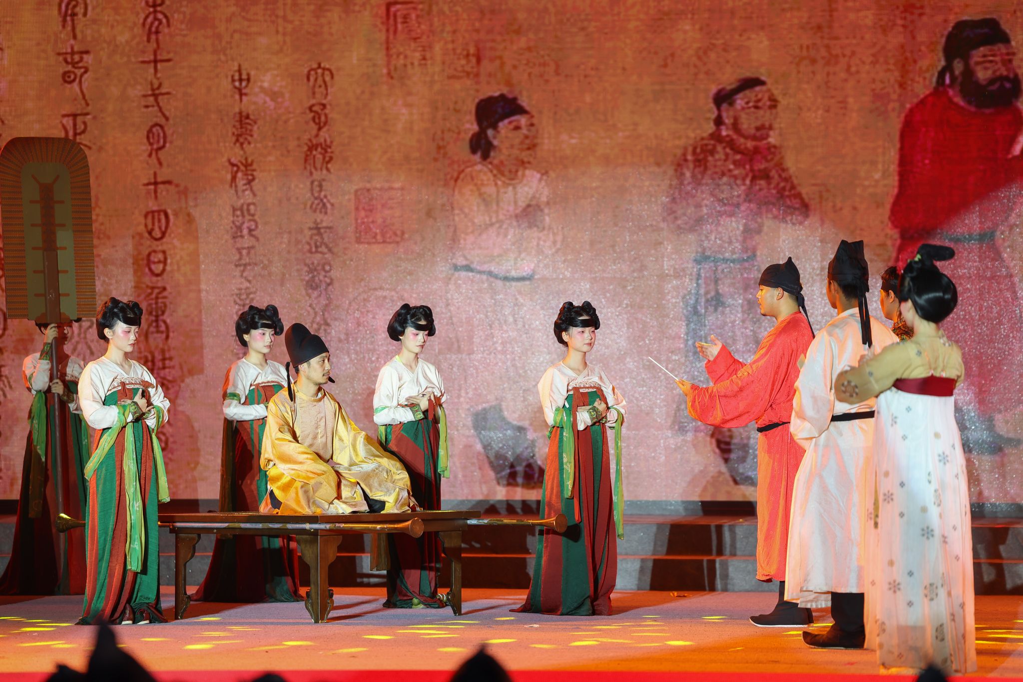 10月16日晚,湖北文理学院举行2025年“隆中山下我的家”迎新晚会暨“美育第一课”,涵盖舞蹈、武术、相声、情景朗诵、小品、舞台剧、合唱等多种表演形式,融合襄阳地域特色介绍、中华优秀传统文化展示、红色精神传承、爱国情怀抒发等。图为师生表演舞台剧《步辇图》。